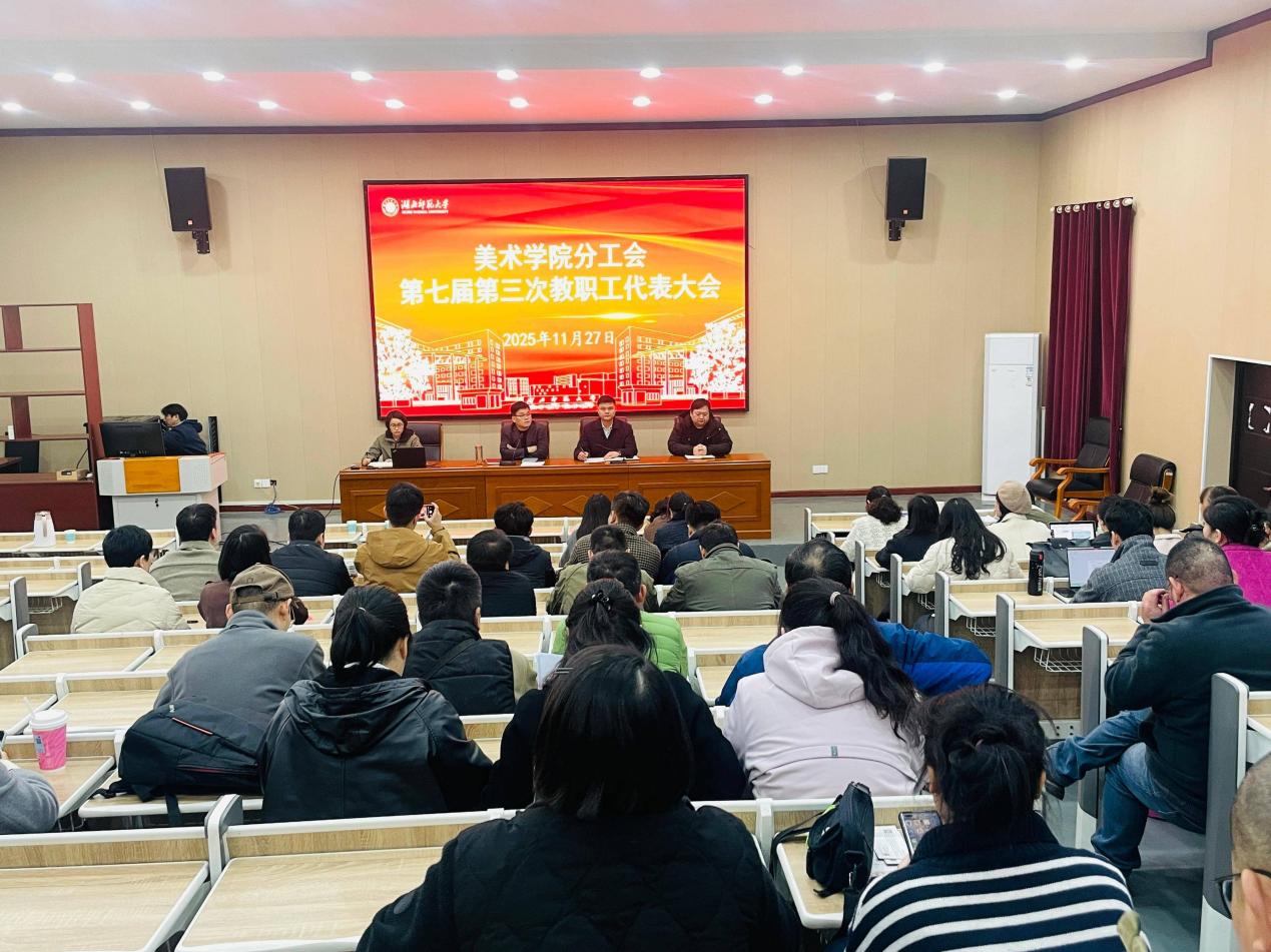 2025年11月24日下午,在庄严的国歌声中,湖北师范大学美术学院第七届教职工代表大会第三次会议在艺术大楼报告厅隆重举行。全院教职工齐聚一堂、群策群力,共绘美术学院发展新篇章。