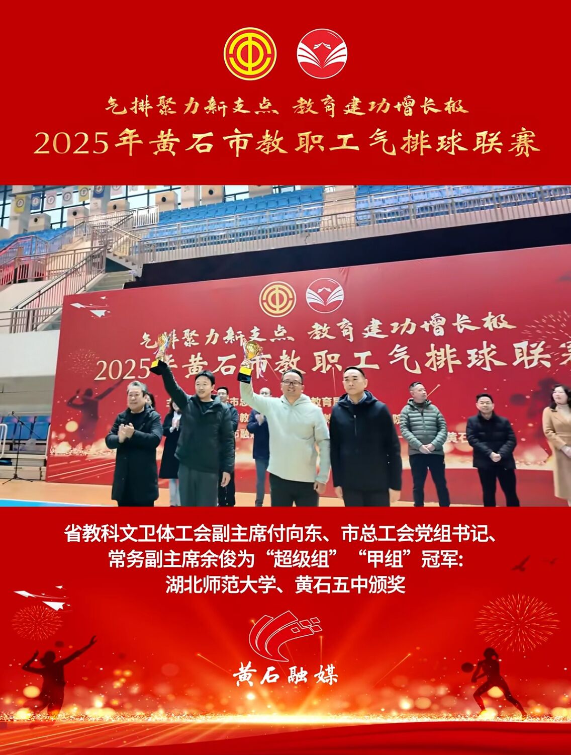 1月18日,“气排聚力新支点,教育建功增长极”2025年黄石市教职工气排球联赛第二阶段竞赛在湖北师范大学附属中学(黄石市第一中学)举行。经过激烈角逐,湖北师范大学勇夺“超级组”桂冠,省教科文卫体工会副主席付向东为学校颁奖。本次比赛由黄石市总工会、黄石市教育局联合主办,来自全市教育系统26家单位共计400余名队员踊跃参赛,共同在气排球场上挥洒汗水、展现风采。