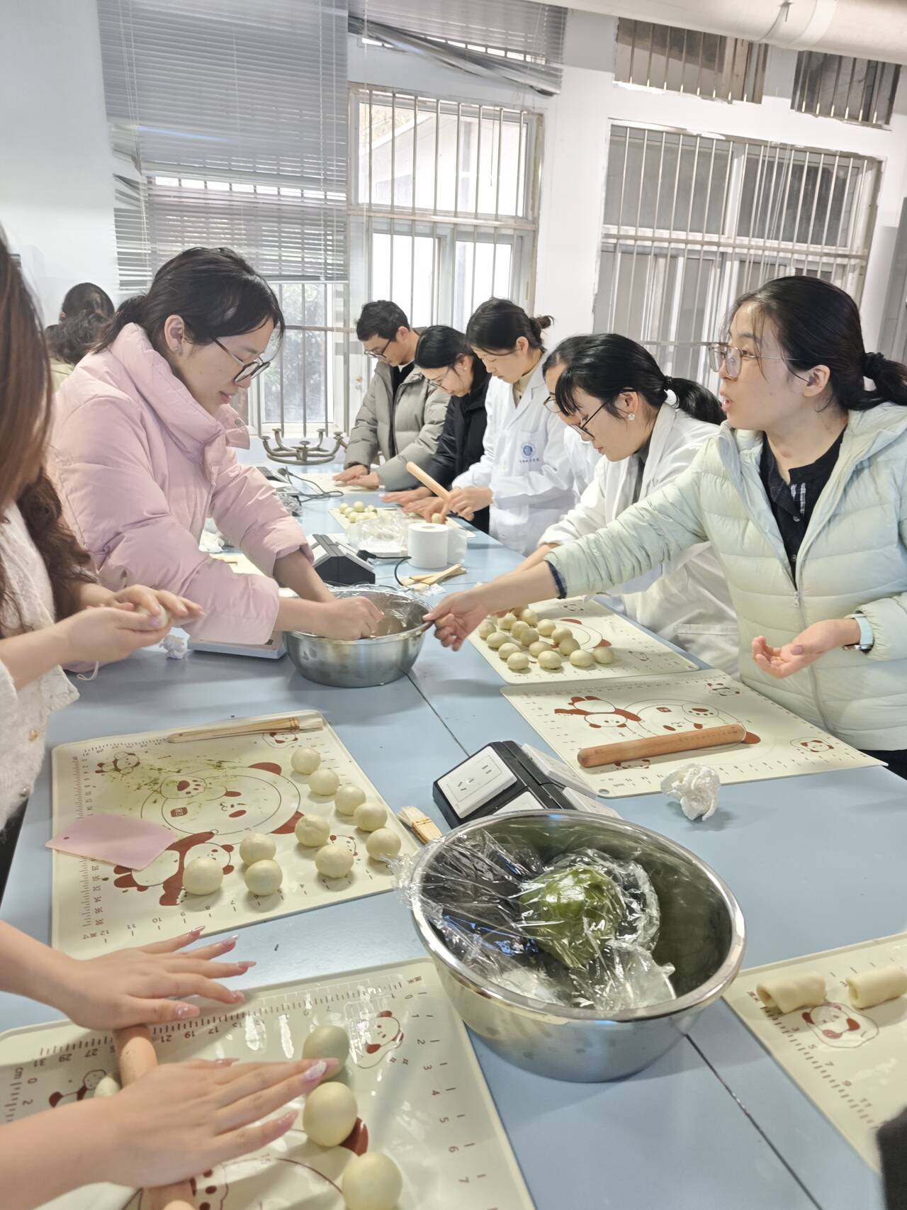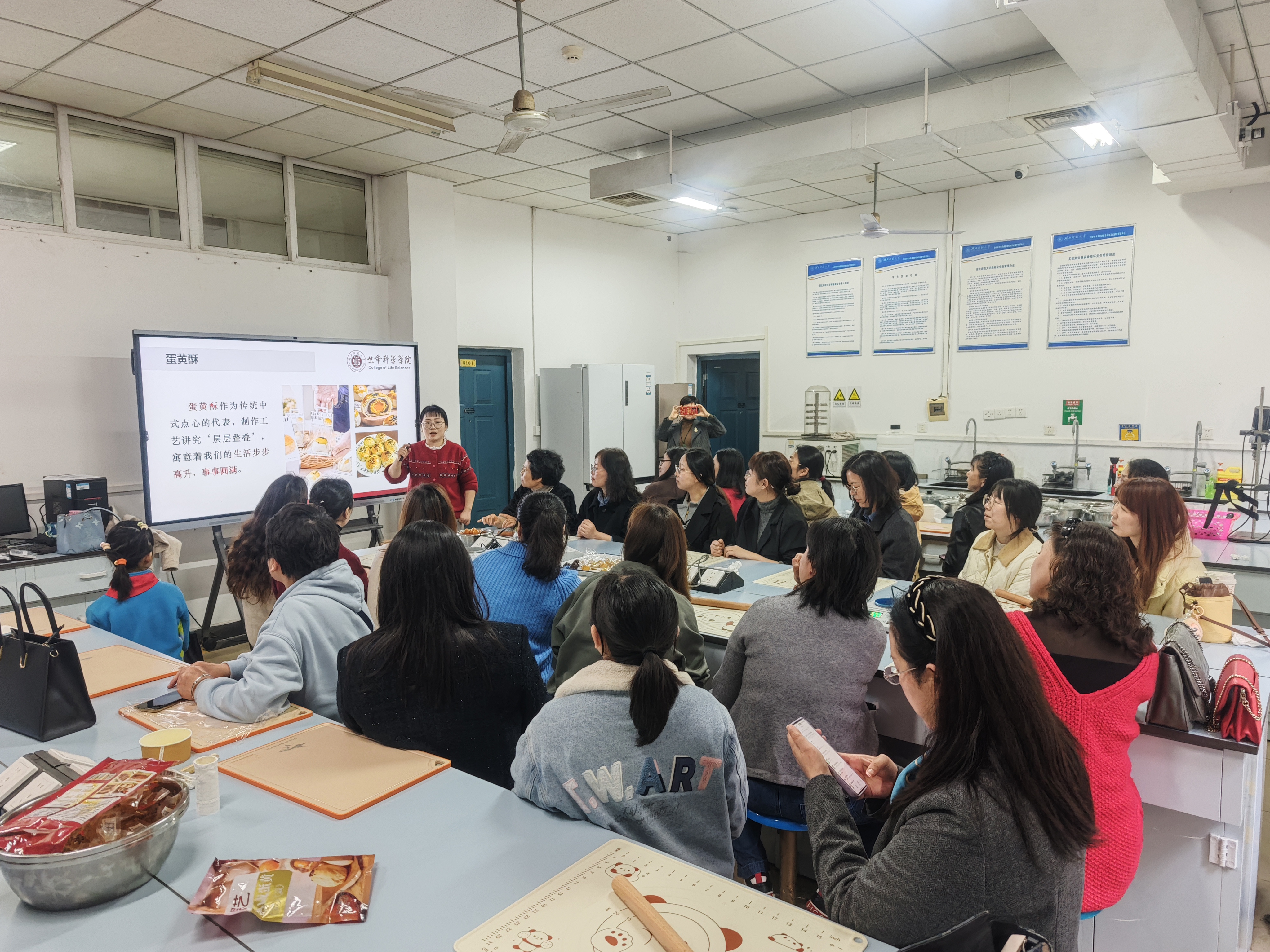 活动当天,生命科学学院教师第二党支部书记、本次手工制作主持人吴琴作为主讲人,充分发挥党员教师的先锋模范作用,将食品科学专业知识转化为通俗易懂的教学内容。她从水油皮与油酥的配比原理讲起,逐步演示包馅、擀卷、刷蛋液等关键步骤,耐心解答学员疑问。在吴琴老师的指导下,参与活动的老师们分组协作,亲手制作蛋黄酥。揉面时的专注、包馅时的细致、等待烘烤时的期待,现场气氛热烈而有序,欢声笑语与烘焙香气交织,构成了一幅温馨和谐的画面。